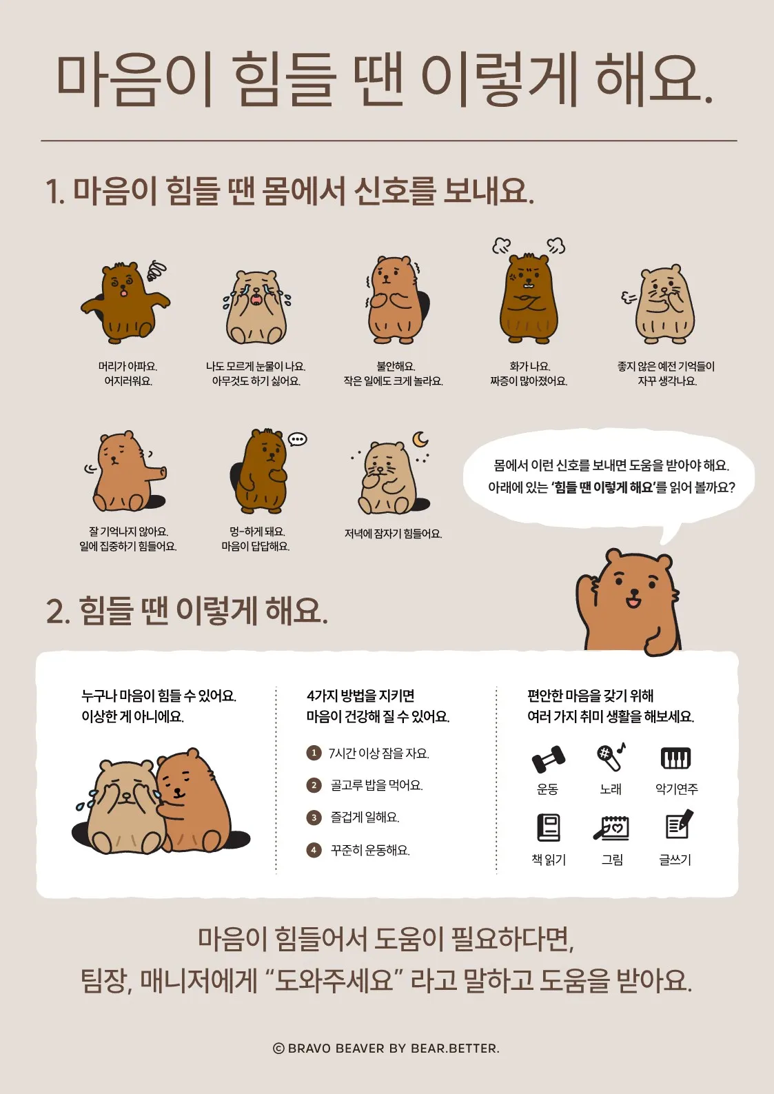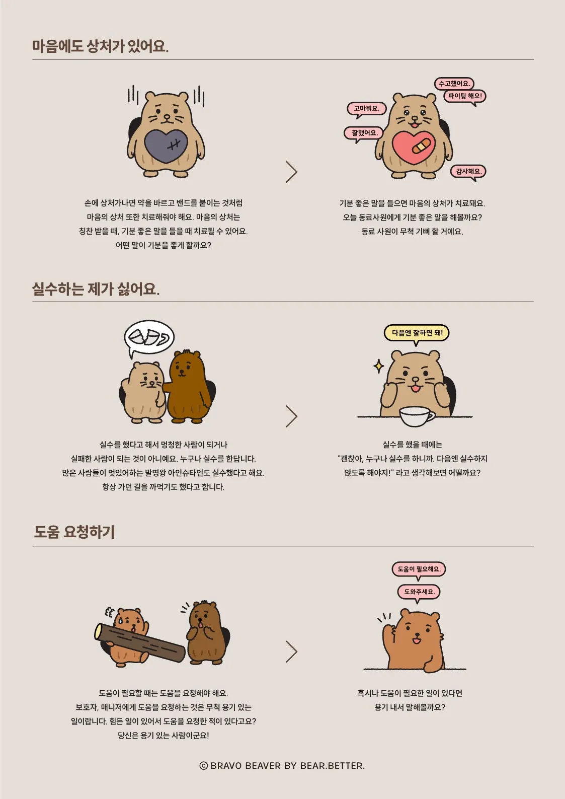 브라보비버는 취업 후 지속가능한 근로를 위해 사원들의 마음을 살핍니다.