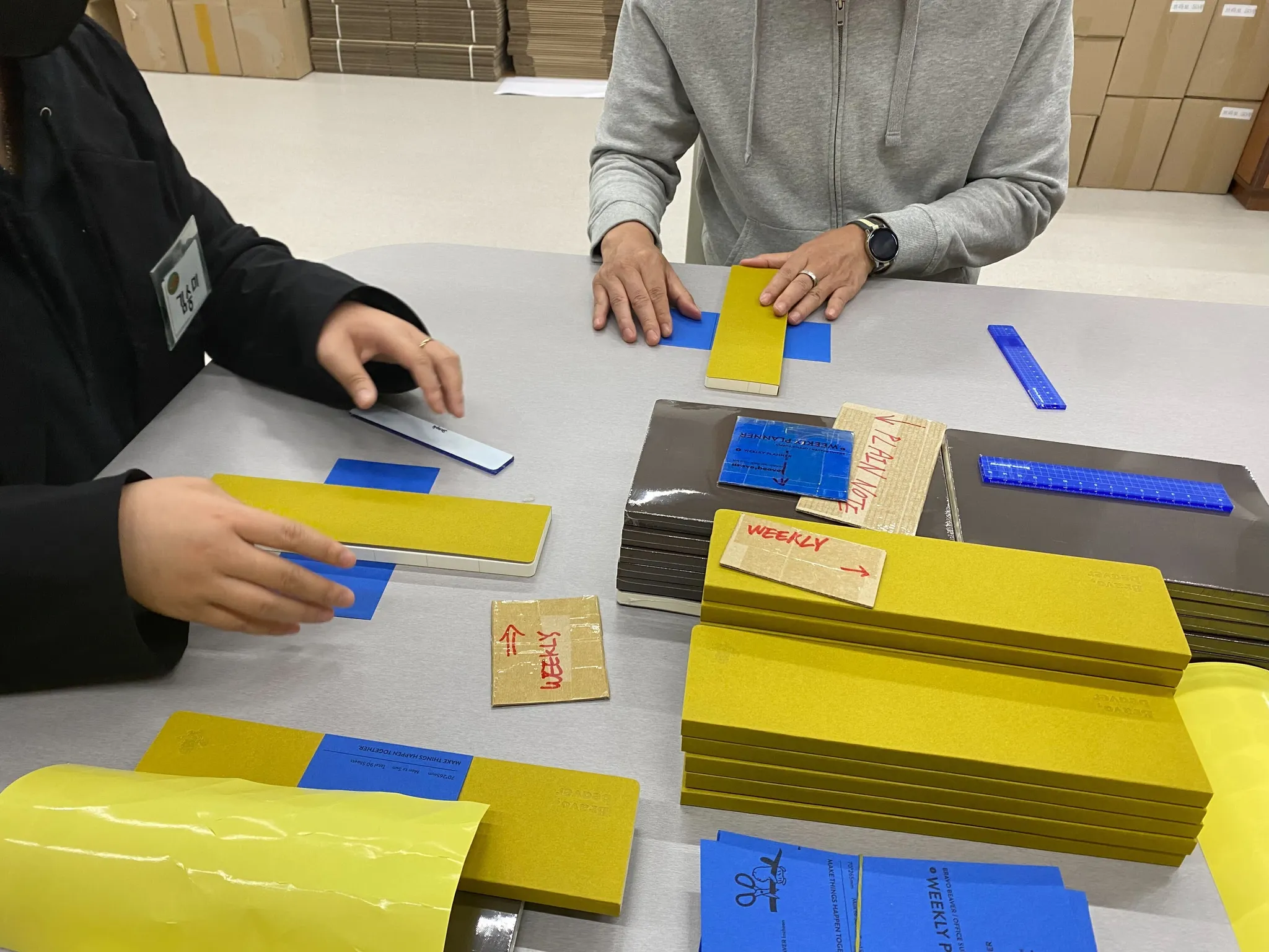 ‘오피스서플라이’의 구성품 중 다이어리와 위클리플래너에 띠지를 붙이는 작업을 함께 해보았어요!